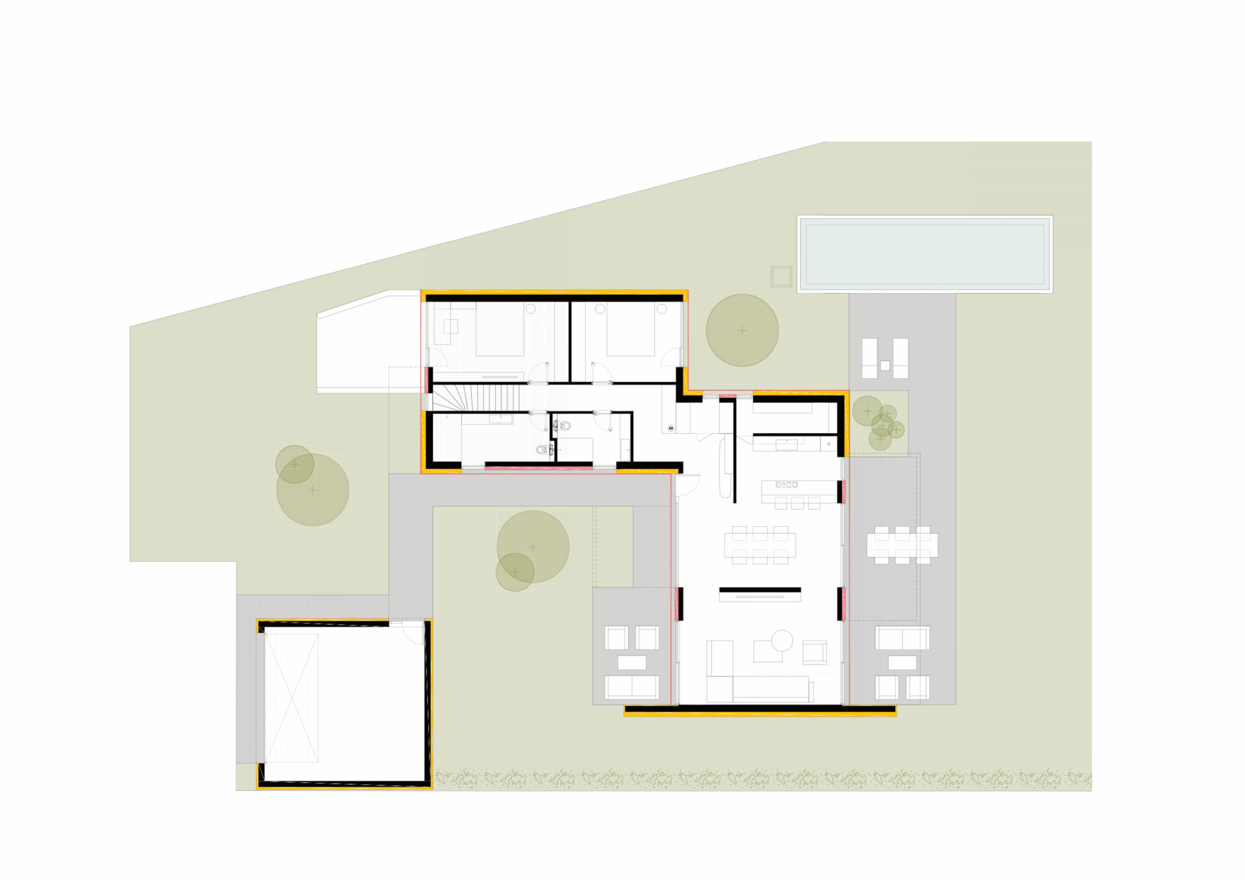 Na pozemku sa nachádza základová doska a suterén, s ktorými sa ráta v aktuálnom projekte. Pozemok je umiestnený na konci slepej Fláviovskej uličke, čo zvyšuje pocit súkromia.